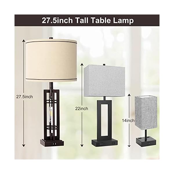 ROTTOGOON Set of 2 Table Lamps with USB Ports, 27.5″ Tall Farmhouse Table Lamp with 2 LED Nightlight Blubs, Bedside Lamp Oil Rubbed Bronze Off White Oatmeal Shade for Living Room Bedroom Home Office