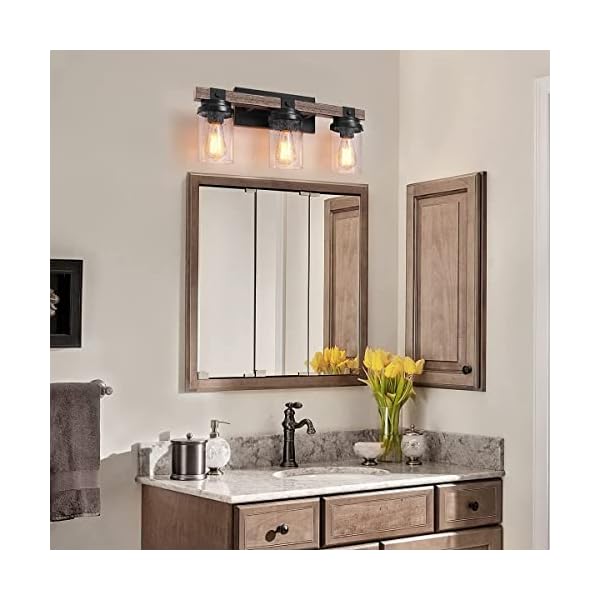 Farmhouse Bathroom Light Fixtures, Rustic Handmade Wood Bathroom Vanity Light with Pretty Glass Shade, Industrial Wall Sconce for Bathroom,Living Room,Hallway (3 Light)