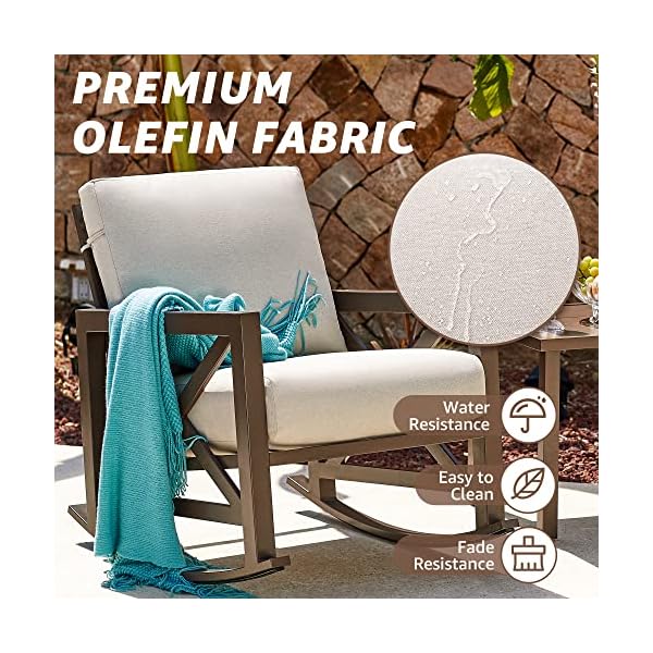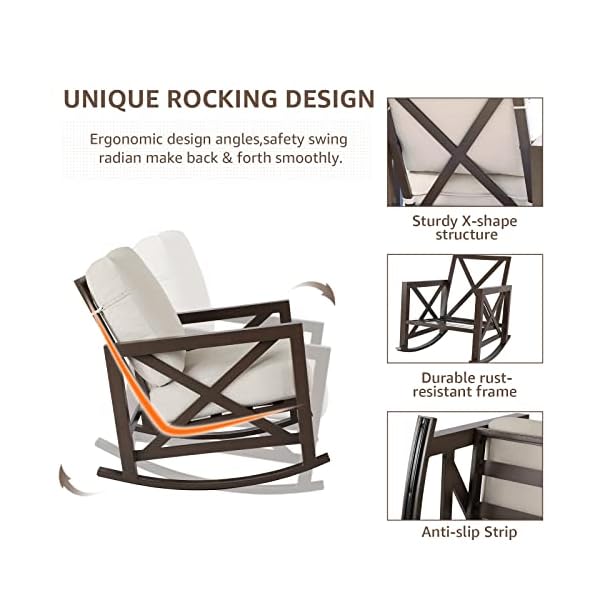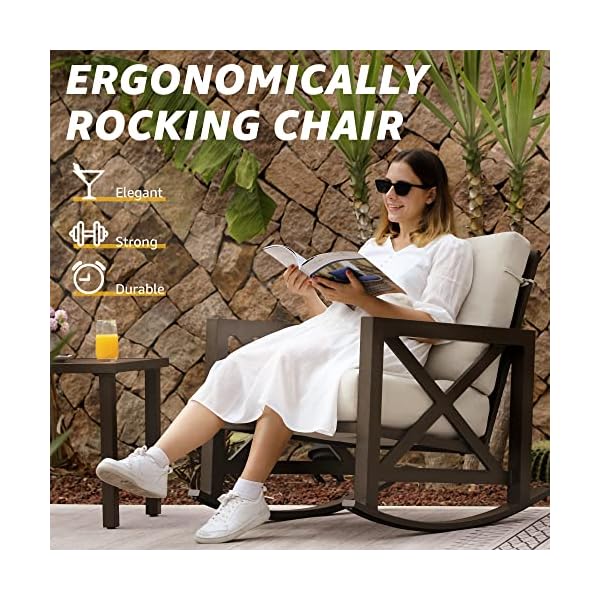 【SAFE ROCKING DESIGN】The outdoor rocking chair design with the specialized back angle construction at a prime degree for optimal rocking, allowing for unassisted smooth and balanced deep or light rocking without the need for constant pushing.While using this metal frame rocking chair, also could relieves waist pressure.