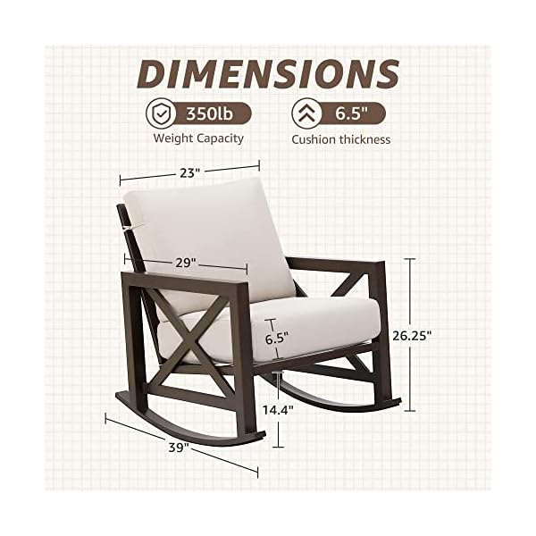 【UPGRADED COMFORT】This patio chair has a comfortable streamlined seat, a ergonomic backrest and wide armrest providing the comfort desired by rocking chairs. 5.5” thick back & seat cushions which provide a comfortable cozy feeling to take a seat and sit down on. The overall dimensions of the rocker chair is 23”L x 39”W x ?”H. The weight capacity is up to 300lbs.