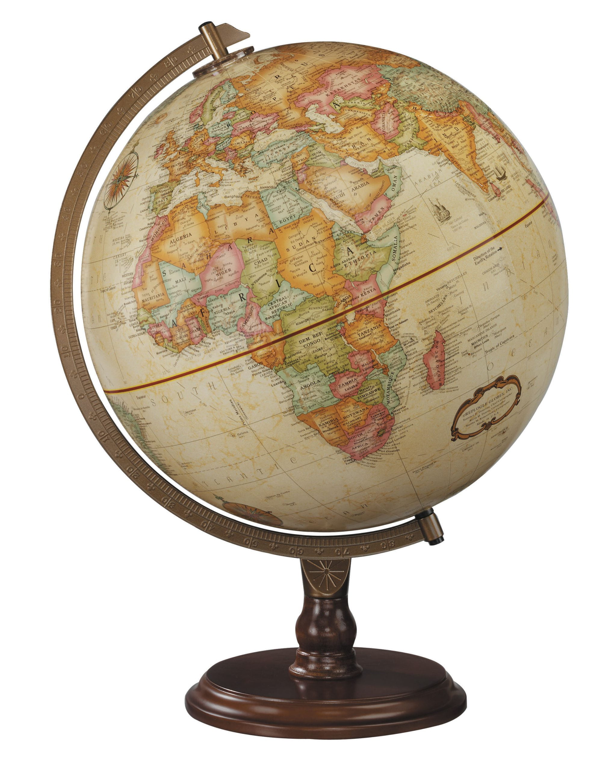 Boasting a classic, enduring appeal, this globe will certainly be admired. Its gracious combination of antique-ocean 12” globe ball, solid hardwood base with rich walnut finish, and painted die-cast semi-meridian make this globe the perfect choice for any setting.