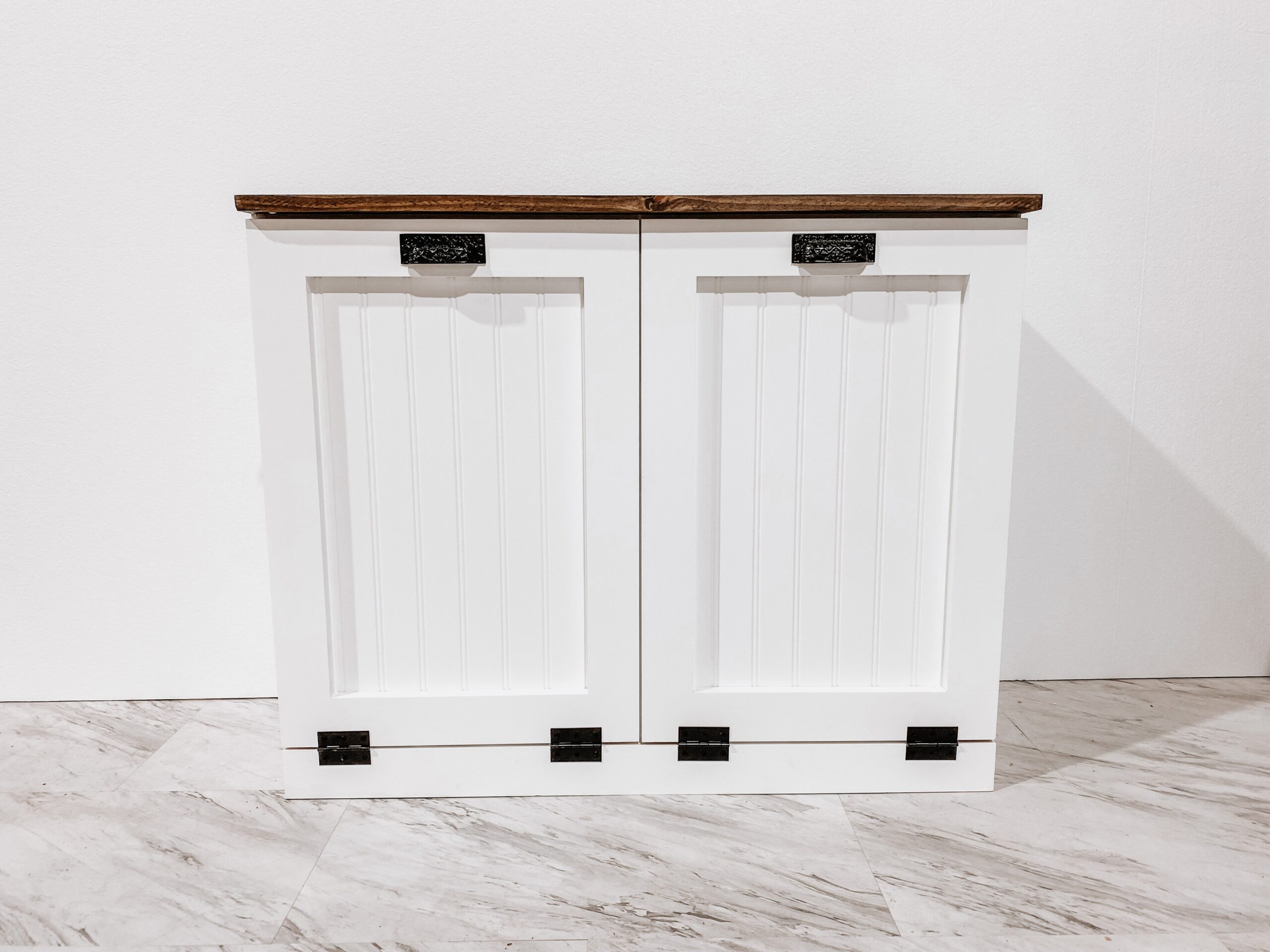 Handmade and finished by us is this beautiful Solid Wood Double Trash & Recycle Cabinet. These cabinets are custom made, they are built with great care and detail. These bins will last generations to come they will not fall apart like store department prefab products.