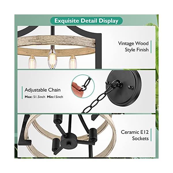 ????【Customized & Adjustable Height】The farmhouse chandelier possesses a strong adjustable chain with a maximum length of 55 inches. Press the hook that may be opened and then lock it with any a part of the chain for length adjustment. Easily customize the height of this unique pendant light fixture according to your preferences.