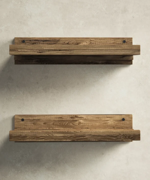This 2-piece floating shelf set lets you display books, plants, and collected curios in the living room or home office, all in rustic, industrial style. Each shelf is made using planks of solid pine wood in a distressed finish that highlights the wood’s unique characteristics and charm. A flat surface provides a perfect platform for storage and display, while a 1″ lipped edge helps keep the shelf’s contents secure. A clean-lined rectangular backplate rounds out the design and affixes each shelf to the wall.