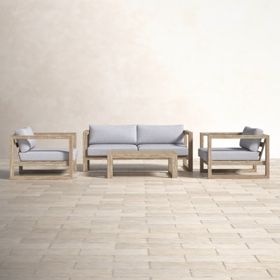 The Ascend 4 Piece Sofa Seating Group creates an elegant feel to any outdoor space. Featuring 2 lounge chairs, 1 two-seater sofa, and 1 coffee table, the set creates an ideal arrangement for comfort. The frame is constructed from solid eucalyptus that naturally repels moisture with a slatted seat construction. Best of all, the set comes with weather-resistant performance fabrics. Birch Lane™ Frame Color: Brown