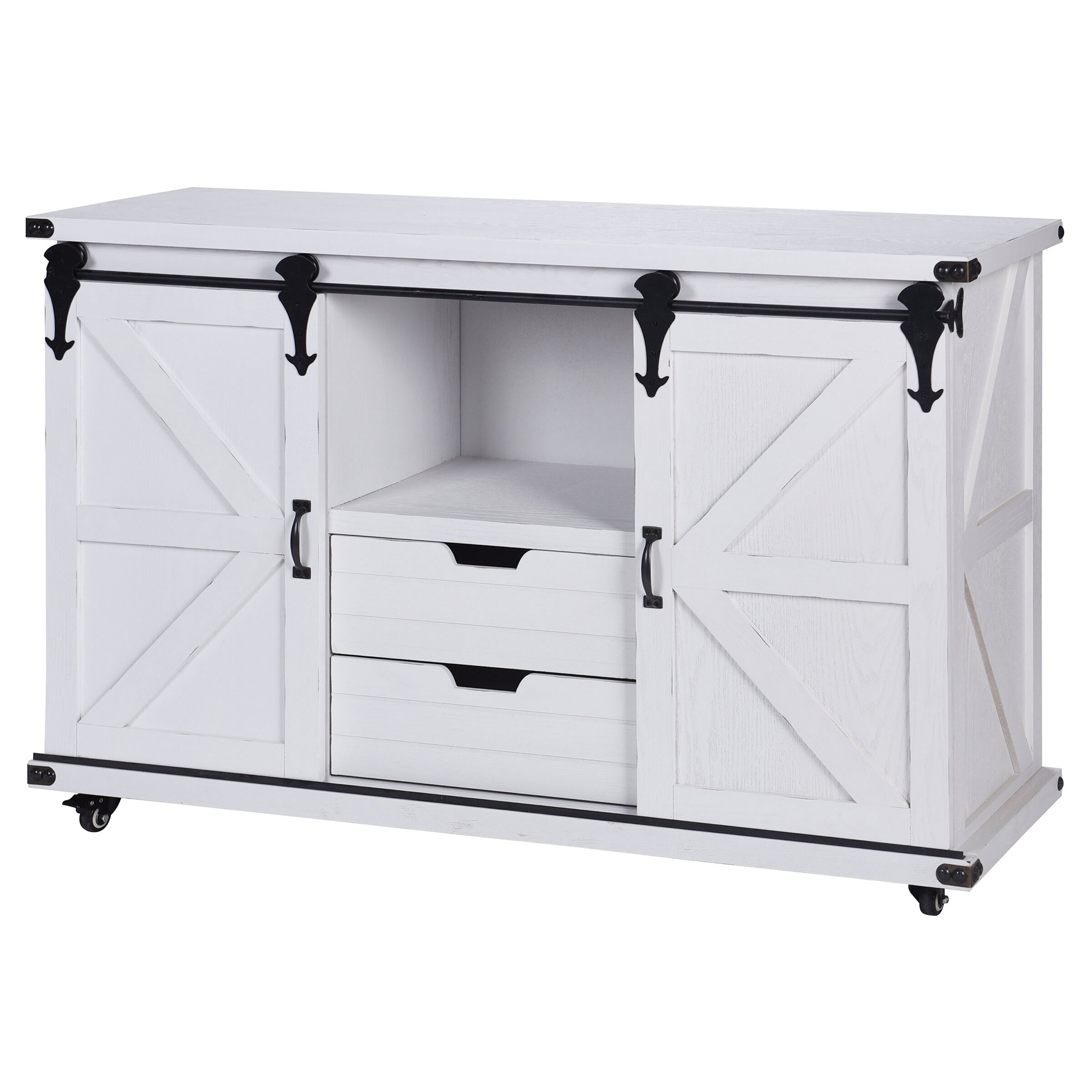 Make a statement in your dining room or living room with this weathered 2-door accent cabinet, the perfect addition to your coastal farmhouse decor. This rustic piece is made from engineered wood and stainless steel with a distressed neutral finish, and it’s built on non-locking caster wheels that easily roll from one spot to the next. Two barn-style cabinet doors glide on an accented metal track, revealing open shelf and drawer space for game consoles, your cable box, and other media items. And the 47″ wide surface is ideal for lamps, glasses, and framed photos. Plus, this cabinet has a tip over restraint device for added safety.