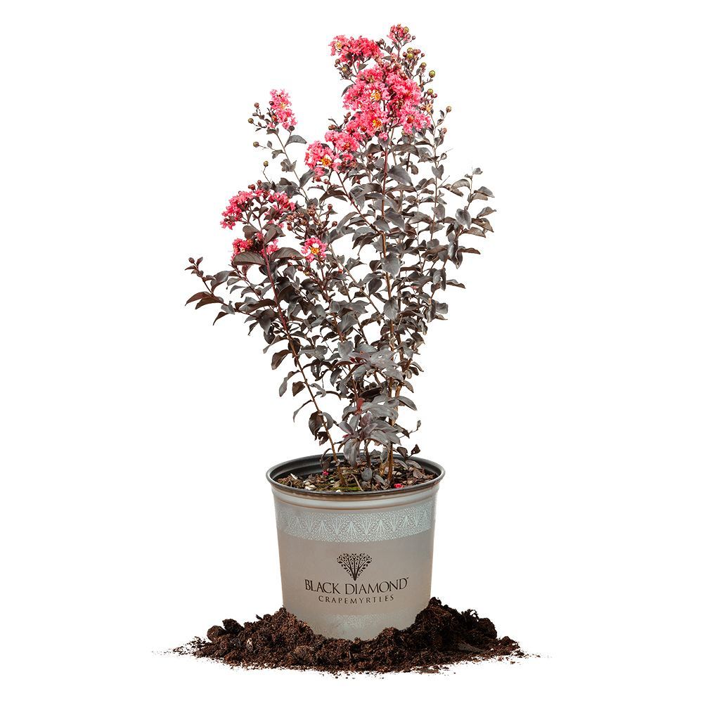 Buy Black Diamond® Shell Pink™ Crape Myrtle Tree Online Dwarf Crape Myrtle Tree With Easy Maintenance! Give your garden a brilliant boost with the vivid beauty that only the Black Diamond Shell Pink Crape Myrtle can provide! The striking jet-black foliage of the Black Diamond Crepe Myrtle contrasts beautifully with the boldly colored coral pink blooms, making it a beautiful centerpiece in the garden or landscape. The pink blooms appear on the flowering hedge in early spring. This brilliant shrub or small tree will bloom all summer up until fall’s first frost. PLANTING BLACK DIAMOND CRAPE MYRTLE TREES For best results, grow the Black Diamond Shell Pink Crape Myrtle in full sun to partial shade with well-amended, well-draining soil; once established, Black Diamond® is very drought tolerant and mildew resistant. The shell pink black diamond series of crape myrtles is exceptionally pest and disease resistant, especially to powdery mildew. The addition of slow-release fertilizer at the top of the root ball will help boost its immunity. These crape myrtle trees do not ship bare root. They are rooted in a container in the soil. Best grown across the United States in USDA plant hardiness zones 6-9. These flowering trees are not the most cold hardy and do best in southern climates. Shop Black Diamond Shell Pink Crape Myrtle for sale. Check out all our Crape Myrtle trees for sale!