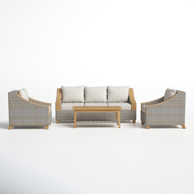 This 4-piece outdoor seating group has the quality materials and coastal farmhouse look we love. Each outdoor furniture piece (it comes with one patio sofa, two chairs with cushions, and a coffee table) has a solid teak wood frame that’s weather-resistant and wrapped in wicker. They’re all hand-woven around durable powder-coated aluminum frames, so you can count on them lasting for years to come. Plus, Sunbrella fabric and stainless steel hardware only add to this patio set’s sturdiness. Birch Lane™