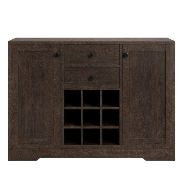 This 2-door & 2-drawer home bar cabinet features clean lines with rustic elements. Crafted from high-quality wood material, this rectangular indoor bar is a permanent piece of furniture in your home. The removable wine grids can hold your 9 precious bottles of wine. Plus, you can also remove the wine grid to place other heavy items. With 2 large capacity drawers, this kitchen coffee bar cabinet is a great place to store small accessories like forks, spoons, and more. The classic black round knob not only gives you easy access to drawers and cabinets. That will be a great Xmas gift for your family and friends.