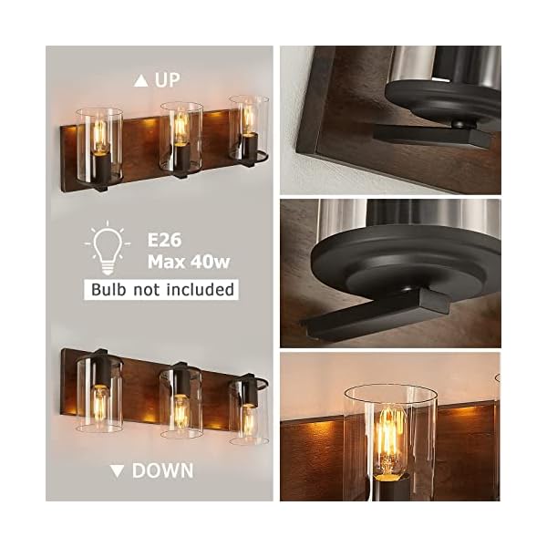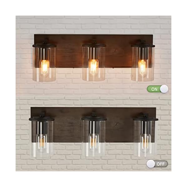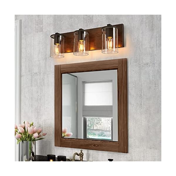 DADUL Farmhouse Vanity Light,3-Light Bathroom Wood Wall Sconce Lighting with Clear Glass Lights Shade, Rustic Vintage Wall Light Fixture Over Mirror for Bedroom,Kitchen,Living Room,Hallway.