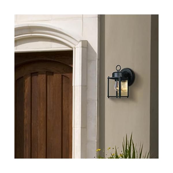 This outside lantern includes a simple, elegant design with a unique style that complements the exterior decor of any home. The clear glass works with the pointy lines and rounded back plate to offer a clean look from the fixture and a warm glow from the sunshine. The solid black finish is treated to forestall pitting, tarnishing, corrosion, and discoloration. The sturdy, weather resistant steel construction and water resistant seal offer protection to the lantern from harsh outside elements to verify the long life of the fixture. These outside lanterns install easily and deliver welcoming, secure and reliable exterior lighting.