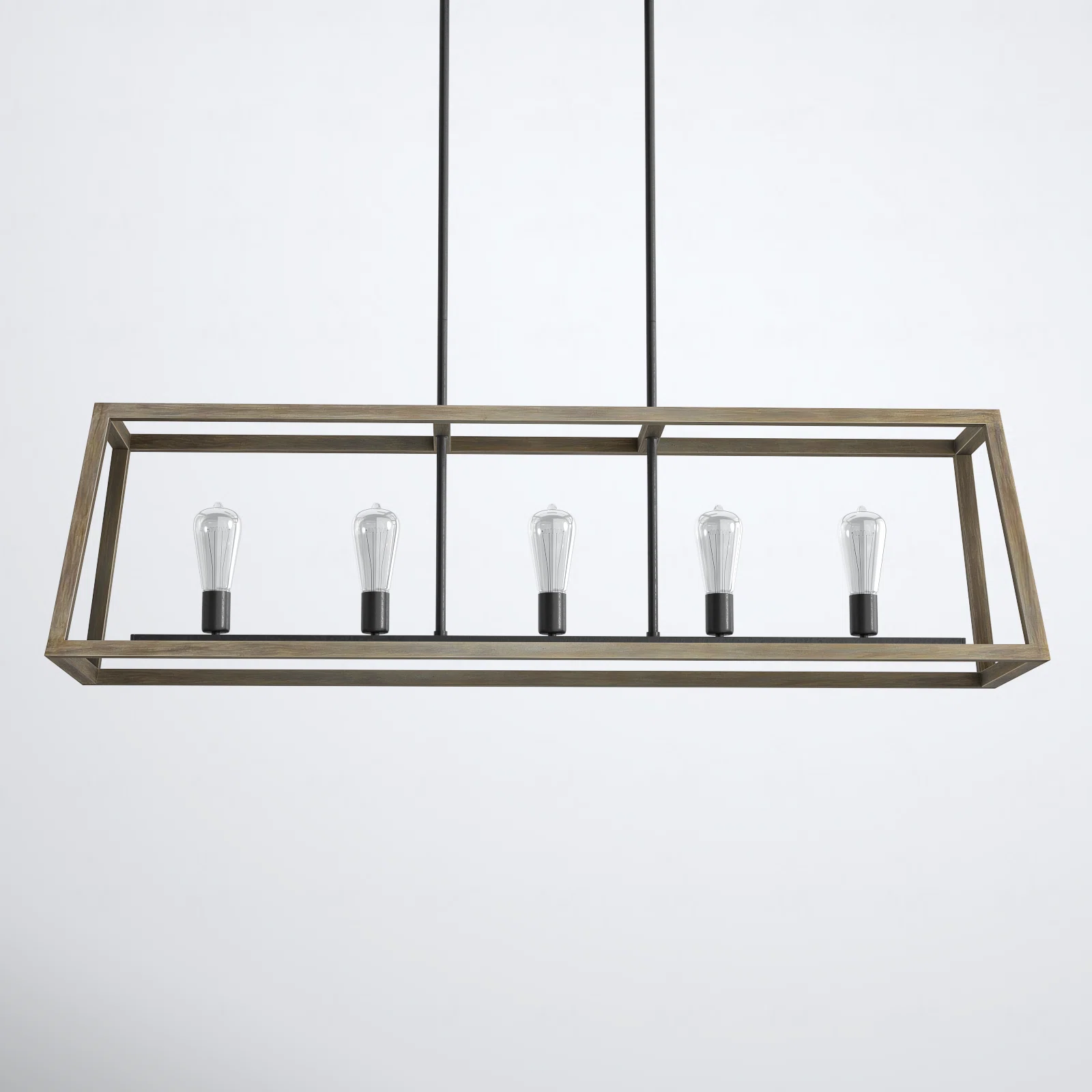 Bold look and clean lines. This 5-light linear pendant wows with traditional charm. Its black metal frame features a weathered oak wood finish, and the open, angular silhouette lets you see the five exposed bulbs, which are sold separately and compatible with a dimmer switch.