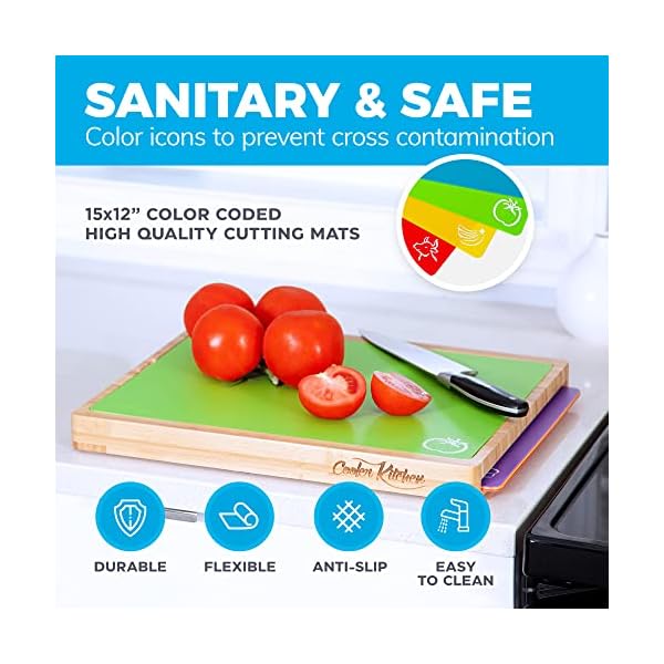 Easy-to-Clean Bamboo Wood Cutting Board Set with 6 Color-Coded Flexible Cutting Mats with Food Icons – Chopping Board Set