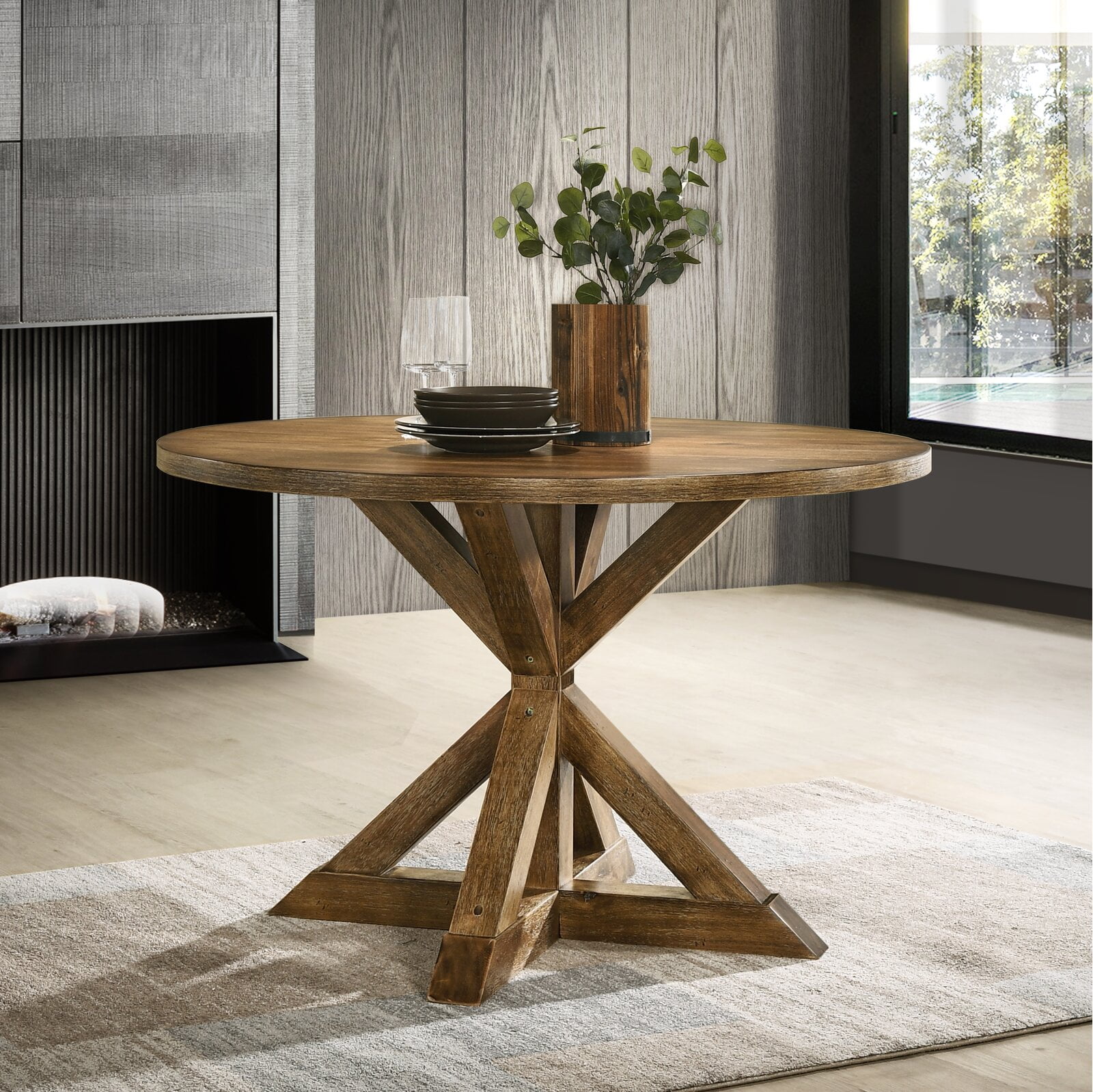 Gather round in rustically refined style with the dining table. The round dining table’s distinctive cross-buck pedestal base is beautifully on-trend, as is the infusion of wood veneers for the dramatic, grainy character. A tabletop with a touch of wood grain detail makes the most of wood’s natural variation. Richly textured, the plush chenille-feel upholstery wrapping the seats brings a soft and sumptuous element to the scene.