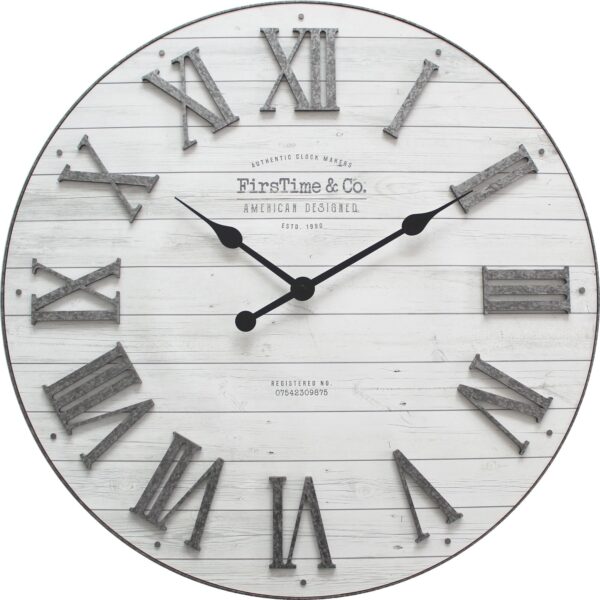 Add the perfect mix of farmhouse decor to your home with this wall clock. Industrial galvanized numerals and nailheads adorn the textured rustic background of this oversized timepiece. With its shiplap style, this favorite planked design is sure to be a charming update to any room.