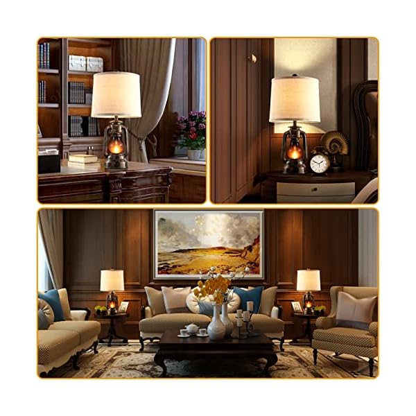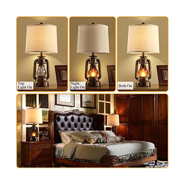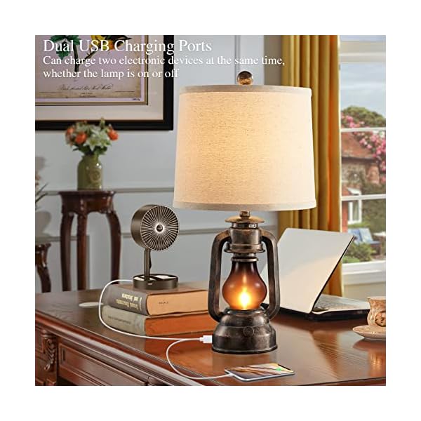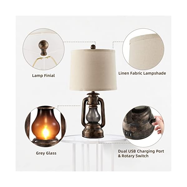 Farmhouse Lantern Table Lamps for Living Room Set of 2, Vintage Bedroom Resin Lamp with Dual USB Charging Ports, Rustic Retro Bedside Nightstand Desk Lamp, Linen Fabric Shade, 4 Bulb Included (Bronze)