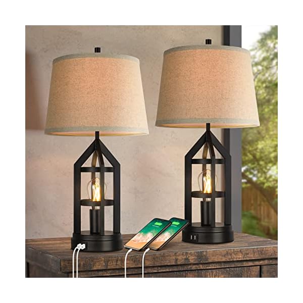 Farmhouse Table Lamps for Living Room Set of 2, 3-Way Dimmable Touch Control Bedside Lamps with 2 USB Charging Ports, Bedroom Reading Lamps for Nightstand, Rustic Home Decor, 4 LED Bulbs Included