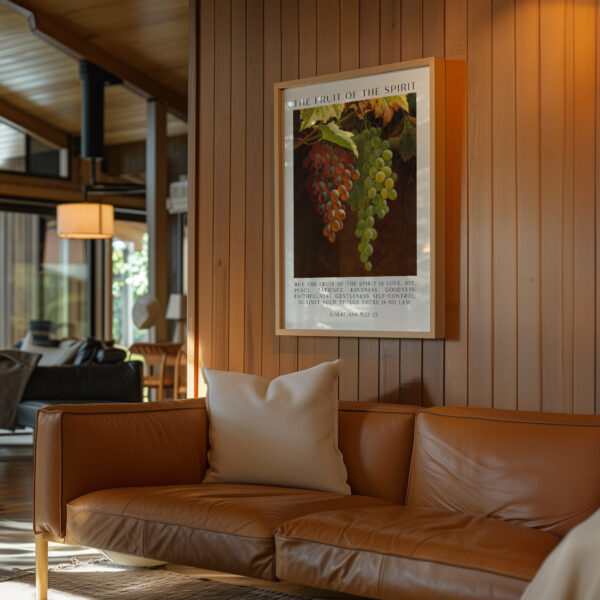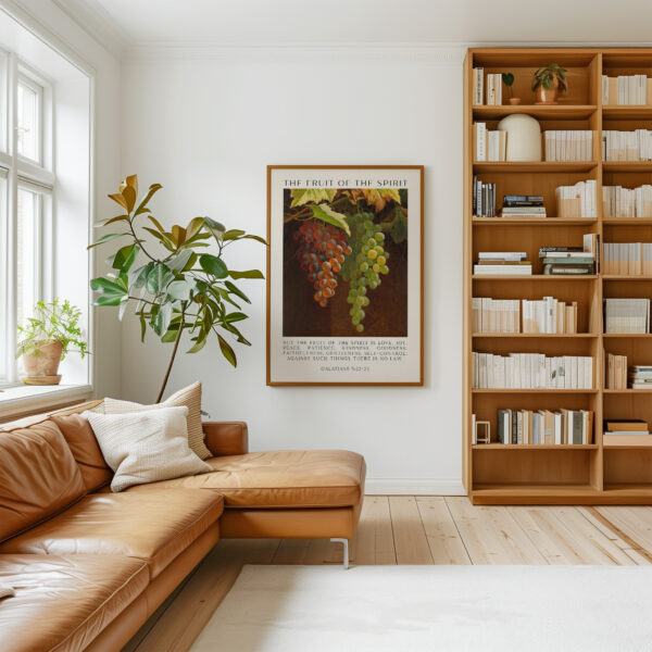 Fruit of the Spirit Bible Verse Wall Art – Galatians 5:22–23 – Christian Typography Print with Grapes Painting
