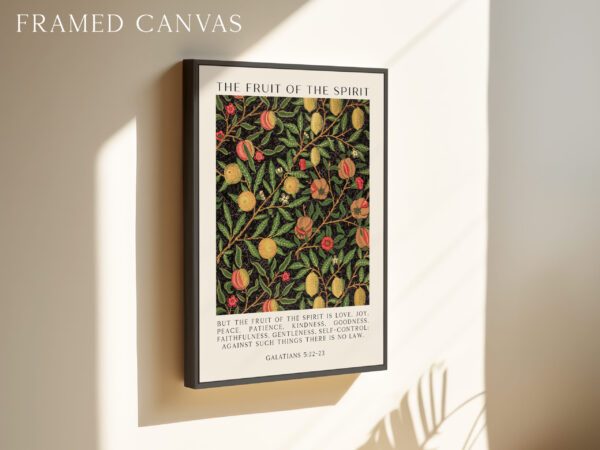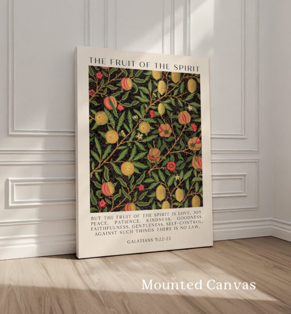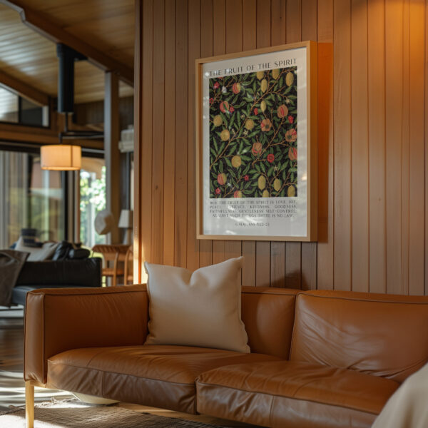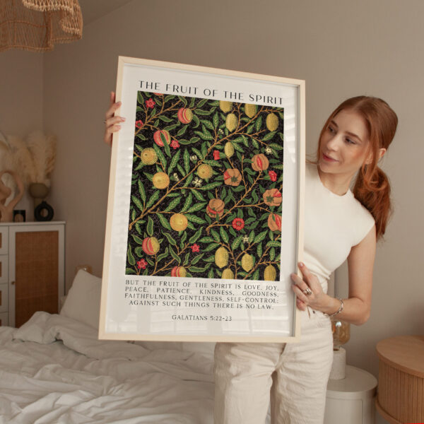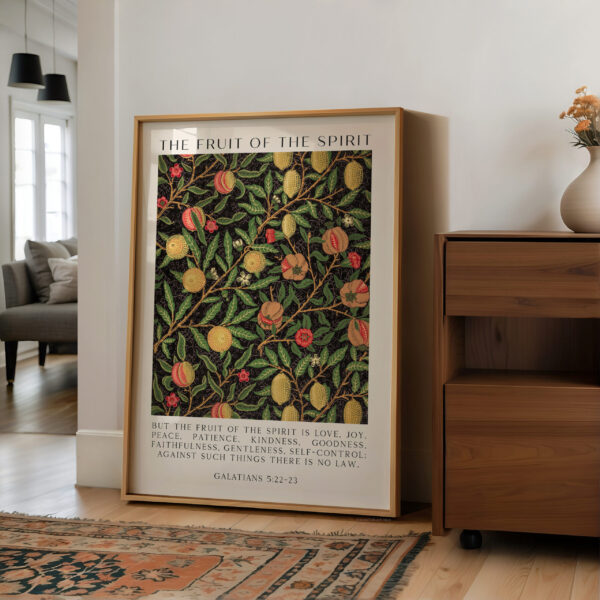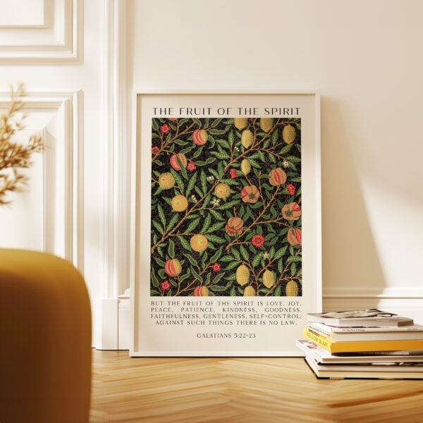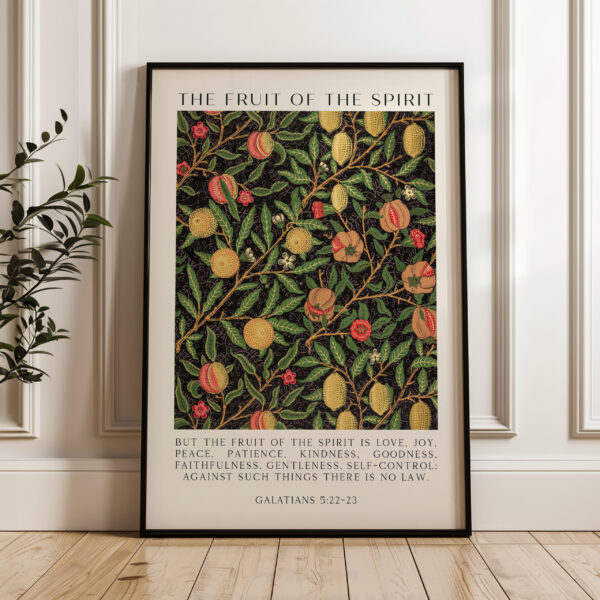Celebrate timeless faith and artistry with this Fruit of the Spirit Typography Art Print, blending William Morris’ botanical design with scripture from Galatians 5:22–23. Featuring lush fruit and floral details, this piece beautifully lists the virtues of love, joy, peace, patience, kindness, goodness, faithfulness, gentleness, and self-control.