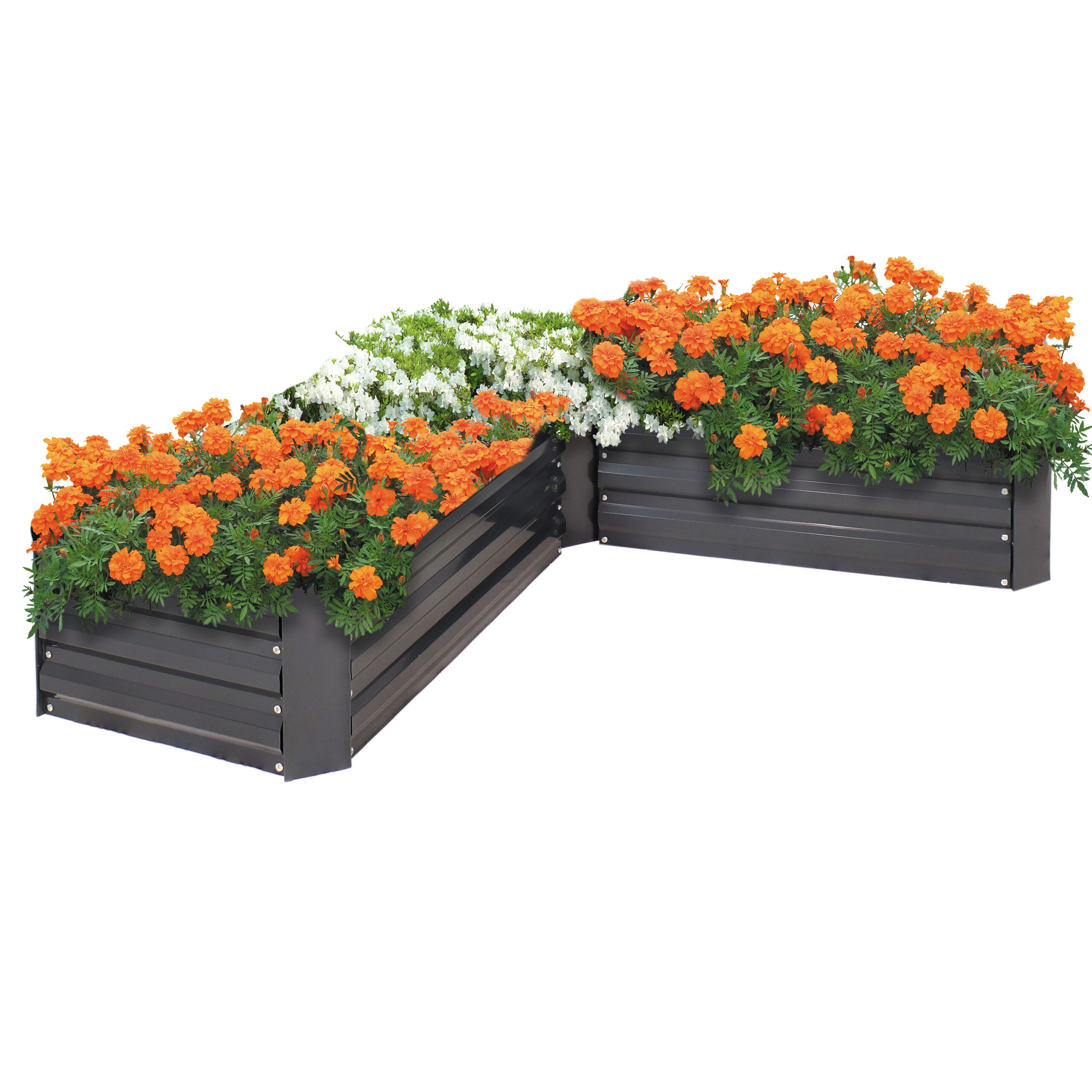 Plant your vegetables, flowers, herbs, and more in this L-shaped raised garden bed. This garden raised bed is made from corrugated galvanized steel to withstand most weather conditions. Galvanized steel won’t crack in freezing temperatures or warp in heat. The planter forms an L-shape to create corners in your raised garden.