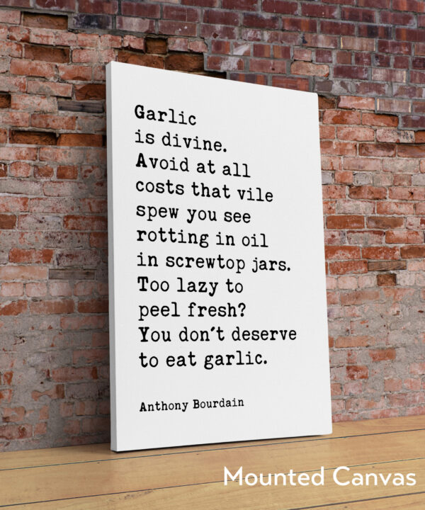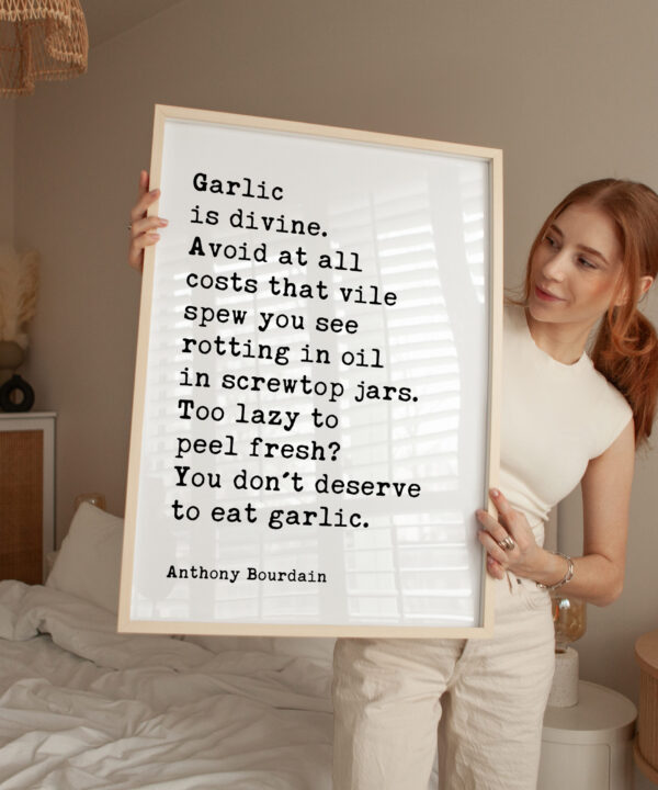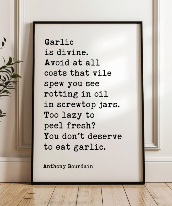 Celebrate the art of cooking with our Typography Art Print showcasing Anthony Bourdain’s unapologetic love for garlic. His words, “Too lazy to peel fresh? You don’t deserve to eat garlic,” serve as a humorous reminder of the importance of using fresh ingredients in the kitchen. This print adds a fun and vibrant touch to your home, making it an ideal gift for foodies, aspiring chefs, or anyone who appreciates the culinary arts.
