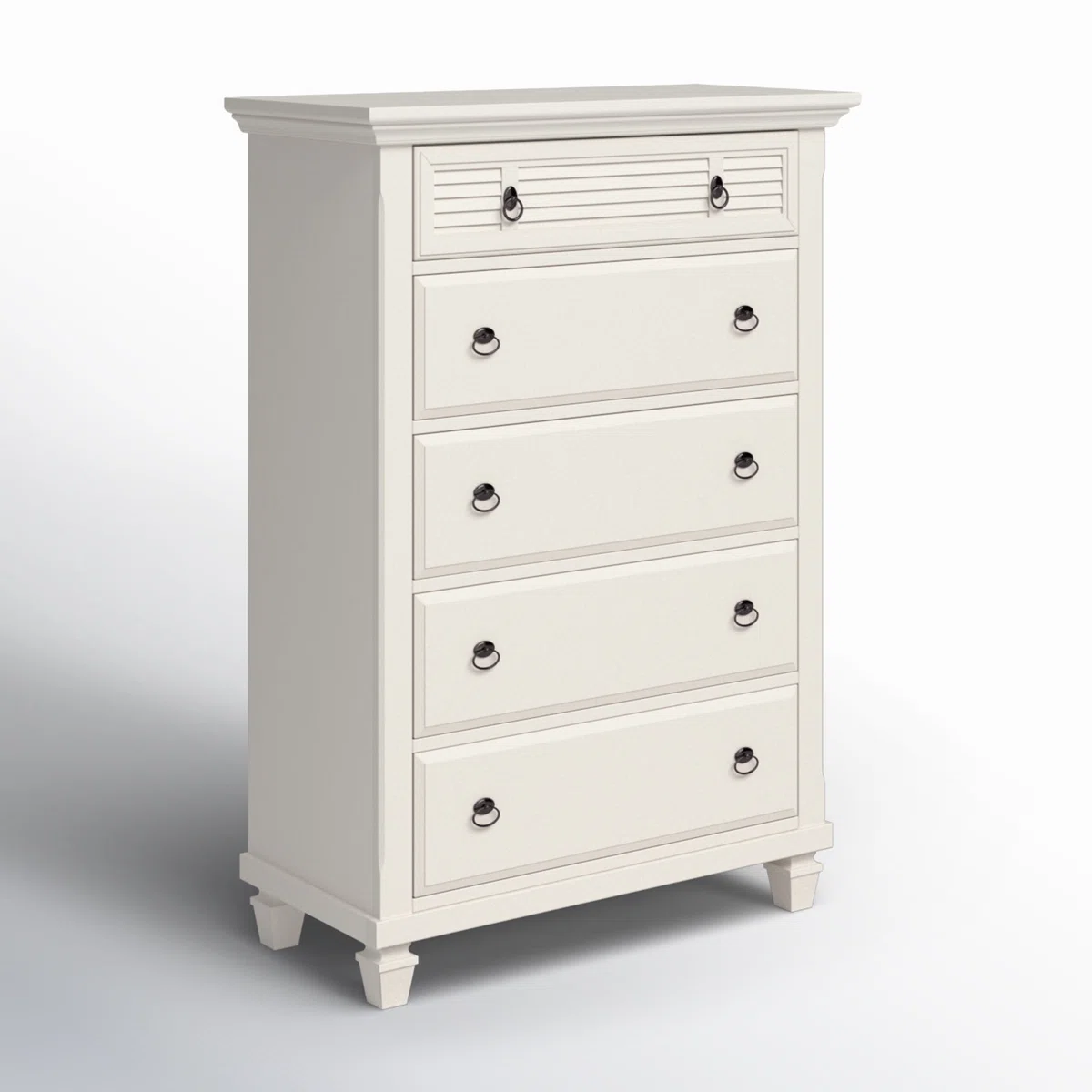 Keep your bedroom beautifully organized with this charming 5-drawer vertical dresser. Crafted from solid wood in a crisp white finish, it brings a bold yet inviting look that blends effortlessly with farmhouse and cottage-inspired décor. Shutter detailing on the top drawer, elegant crown molding, and spade feet add character and timeless appeal. Spacious dovetailed drawers with bronze ring pulls offer ample storage for clothing and linens, while an included wall anchor ensures added stability—perfect for bedrooms big or small.