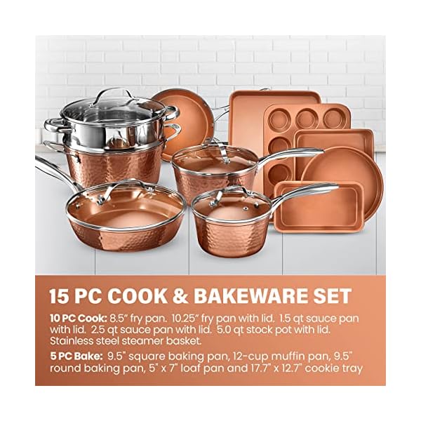 Gotham Steel Hammered Pots and Pans Set Nonstick, 15 Pc Elegant Kitchen Cookware Set & Bakeware Set, Ultra Durable Pots and Pans for Cooking with Nonstick Ceramic Coating, Dishwasher Safe, Toxin Free