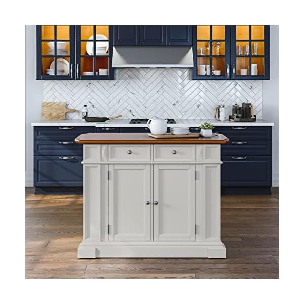 Versatile, functional and stylish all describe this kitchen island with its White finished body and coordinating cottage oak finished top. Enhancing the overall style, The top features hand applied physical and finished distressing. The island not only provides added kitchen work surface and storage but with its 11-1/2-inch breakfast bar extended also provides a convenient place to grab a bite to eat or enjoy a morning cup of coffee. Find adjustable shelving on both ends of the island in addition to two utility drawers and two cabinets, each and every with two adjustable shelves yielding plenty of storage. Construction is of sustainable hardwood with a clear coat finish helping to give protection to against wear from normal use. Requires assembly. Measures 49-3/4-inch width by 26-1/2-inch depth by 36-1/2-inch Height.