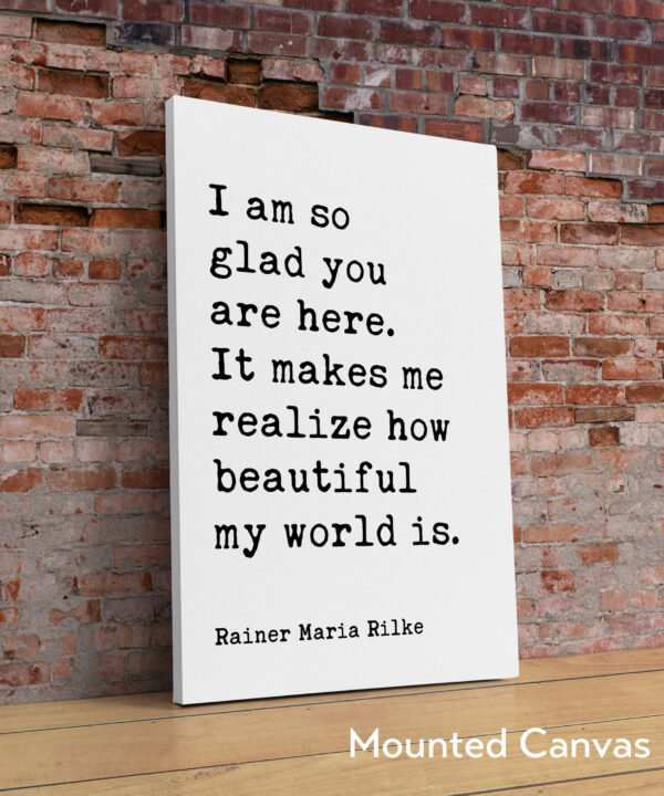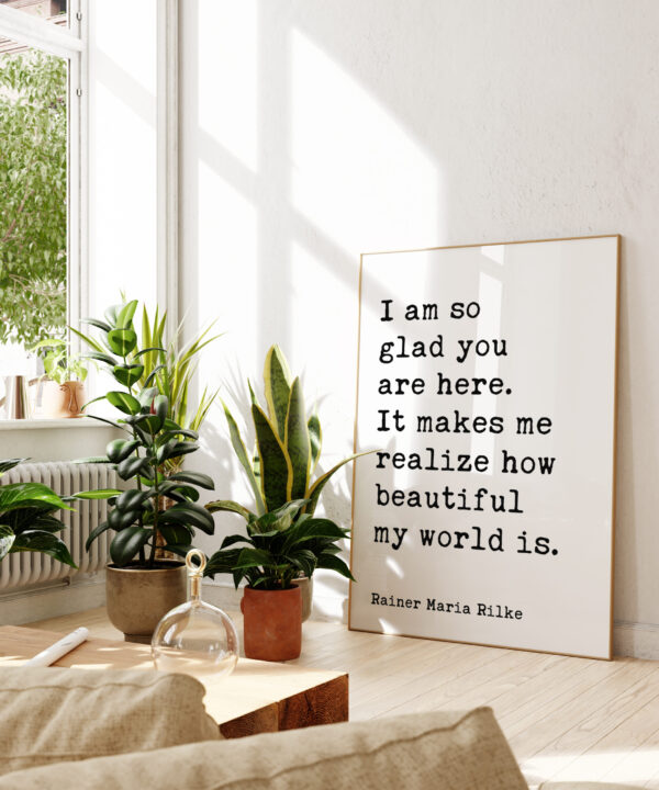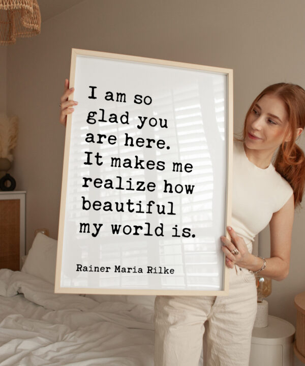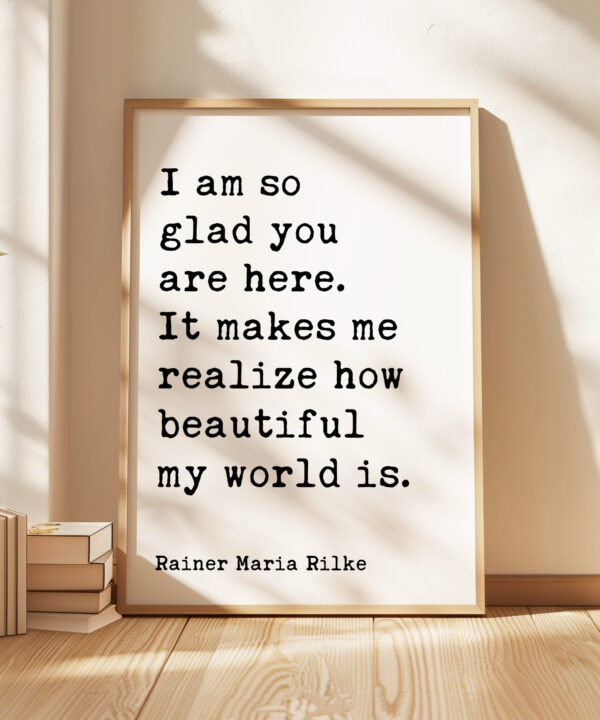 Illuminate your space with our Typography Art Print featuring Rainer Maria Rilke’s beautiful words: “I am so glad you are here. It makes me realize how beautiful my world is.” This print serves as a touching reminder of the impact loved ones have on our lives. Perfect for your home, office, or as a thoughtful gift for someone special, it adds a personal touch to any room. Celebrate the beauty of connection and appreciation with this elegant piece.