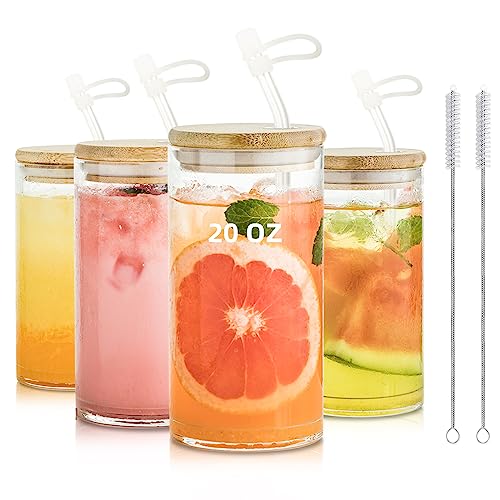 Package List: Includes 4 x Large juice Glasses, 4 x Reusable Straw with Silicone Straw Stopper , 4 x Bamboo lid , 2 x Straw Brush. High quality borosilicate glass, smooth yet durable, comfortable to pick up and hold. Crystal clear glasses, any drinks looks nice inside and make a good ins photo.