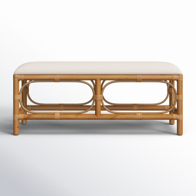 A refreshing coastal accent featuring a crisp white textured fabric, over a naturally finished solid wood base with rattan-wrapped accents. Perfect at the foot of a bed or as additional family room seating. Birch Lane™