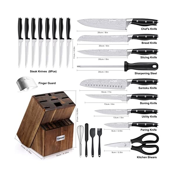 [Easy Care & Storage] – All knives are well organized into 1 wood block that made of durable natural oak, it assists in keeping keen edge for your blades, and make a handsome addition to a countertop.