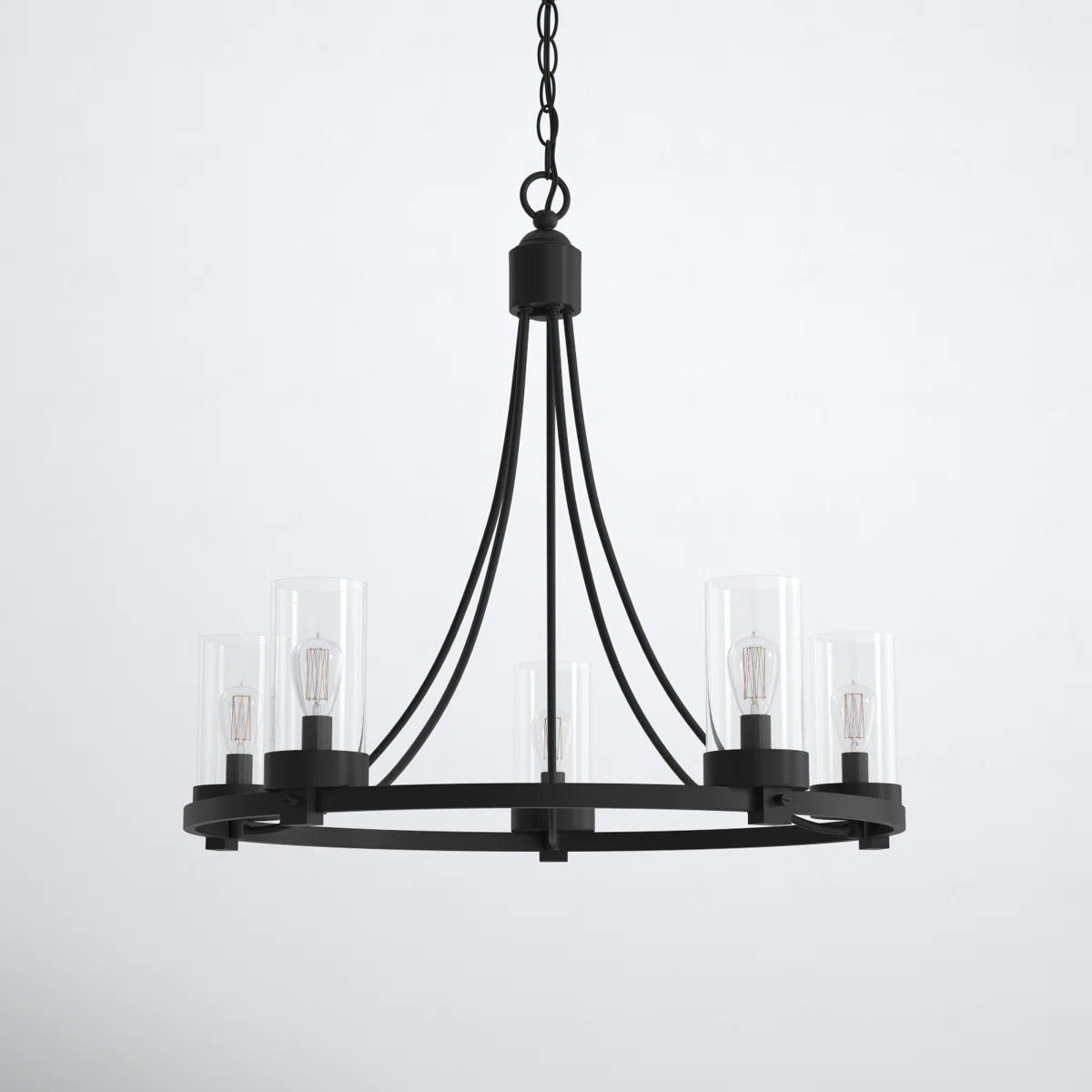Create a warm, inviting atmosphere in your living space with this wagon wheel chandelier, designed to deliver generous ambient lighting for gatherings and everyday moments alike. Crafted from an open circular metal frame with a subtly tapered top, this fixture features five cylindrical, hand-blown glass shades for a refined rustic look. It accommodates five candelabra bulbs up to 60W each (sold separately) and is fully dimmable, allowing you to set the perfect mood—from bright family game nights to cozy movie evenings. An adjustable-height chain and sloped-ceiling compatibility ensure a seamless fit in a variety of spaces.