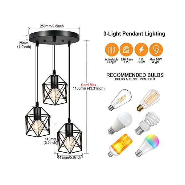 ✔️【Bulb Requirements】Bulbs aren’t included. The caged pendant light fixtures requires 3 x E26 base bulb (Max 60W for each light). The farmhouse pendant light is fully dimmable when used with a dimmer bulb and compatible dimmer switch(not included) with the intention to keep watch over desired brightness.