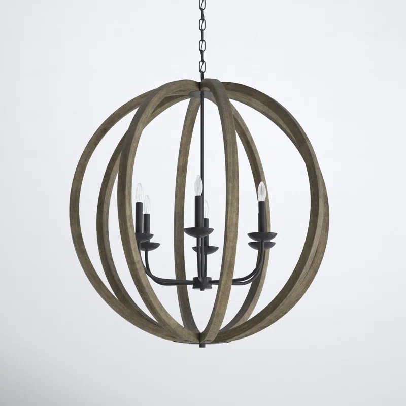 One sure way to welcome in some farmhouse warmth to your dining room is with this 6-light chandelier. Its open globe-shamed frame is made from kiln-dried wood in a rustic brown finish that has a lived-in look.