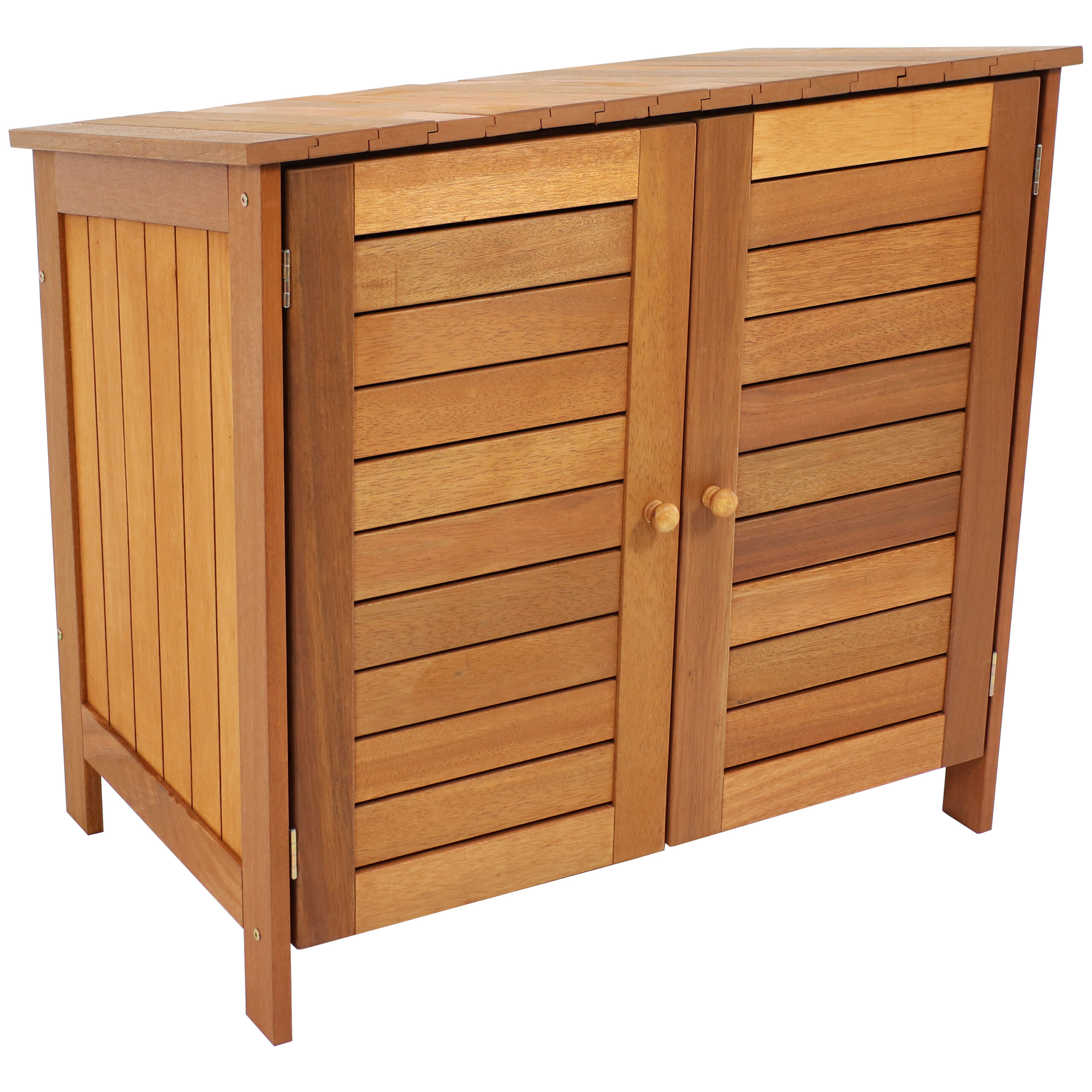 Give your patio or garden a stylish organization solution with this horizontal small garden storage shed. Durably constructed of meranti wood, the material of this outdoor utility shed is enhanced with a teak oil finish. This outdoor storage cabinet includes the components and hardware necessary to put it together but not the tool (Phillips screwdriver) required for assembly.