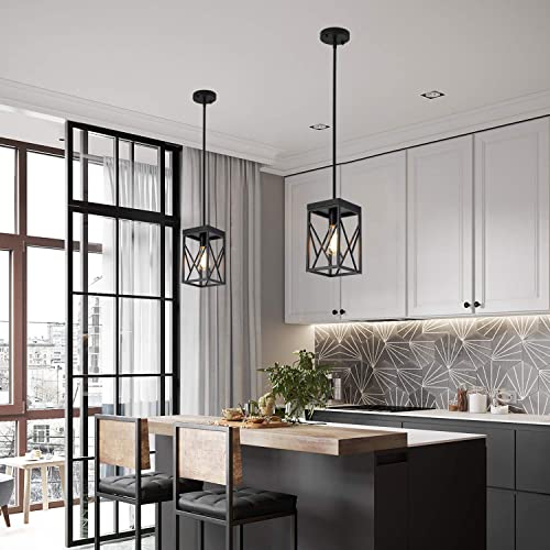 Modern Black Pendant Light with Metal Cage, One-Light Adjustable Rods Industrial Mini Pendant Lighting Fixture for Kitchen Island Cafe Bar Farmhouse, Black