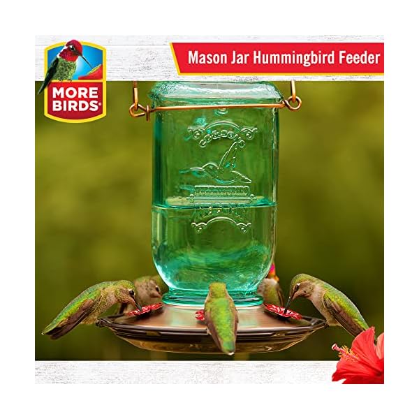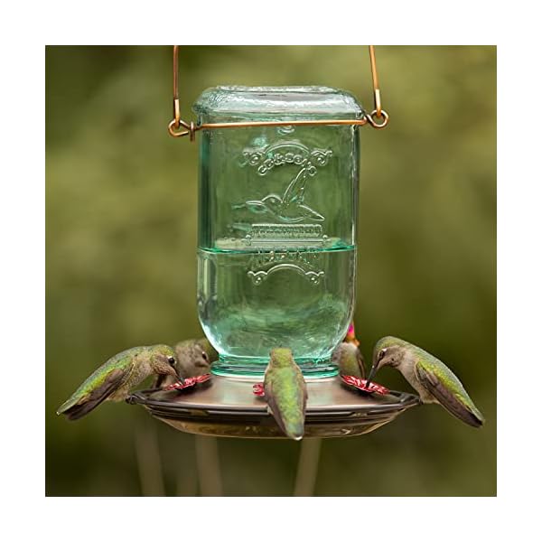 The More Birds Mason Jar hummingbird feeder with its aqua-tinted antique glass bottle and beautiful brushed bronze finish give it a vintage feel that adds a splash of bygone good looks in your backyard. Wrap-around perching space surrounds the durable metal basin cap, which features five integrated red flower feeding ports to draw more hummingbirds. With a 25 ounce nectar capacity, the four-sided Mason Jar hummingbird feeder provides numerous nectar to keep hummingbirds happy and coming back for more! Its wide bottle opening and detachable flat base make filling simple and cleaning a breeze. When cleaning your hummingbird feeder, don’t put your feeder within the dishwasher, as the high temperatures can permanently damage the feeder parts. So much expert sources discourage dishwashing because it would possibly not fully disinfect any avian diseases. Moreover..