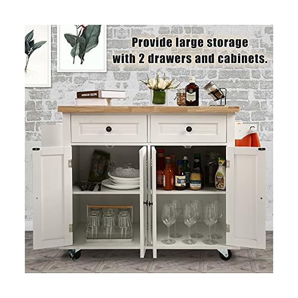 [High Quality Material]:The kitchen trolley cart is built from a natural solid rubber wood top,pine wood legs and MDF for long-lasting durability.The white surface is painted, suitable for placing in a humid environment.It is more in keeping with the tidy kitchen and dining room, making your meal more enjoyable.Smooth and waterproof finish are easy to clean.
