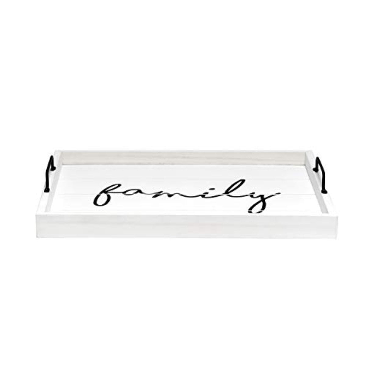 Freshen up your home with this wooden tray! Accented with black metal handles and text this tray is on-trend to give your home that cozy farmhouse feels. Use to serve breakfast in bed, food, and drinks at a party or makes for an excellent centerpiece for your dining table, kitchen counter, coffee table, or ottoman.