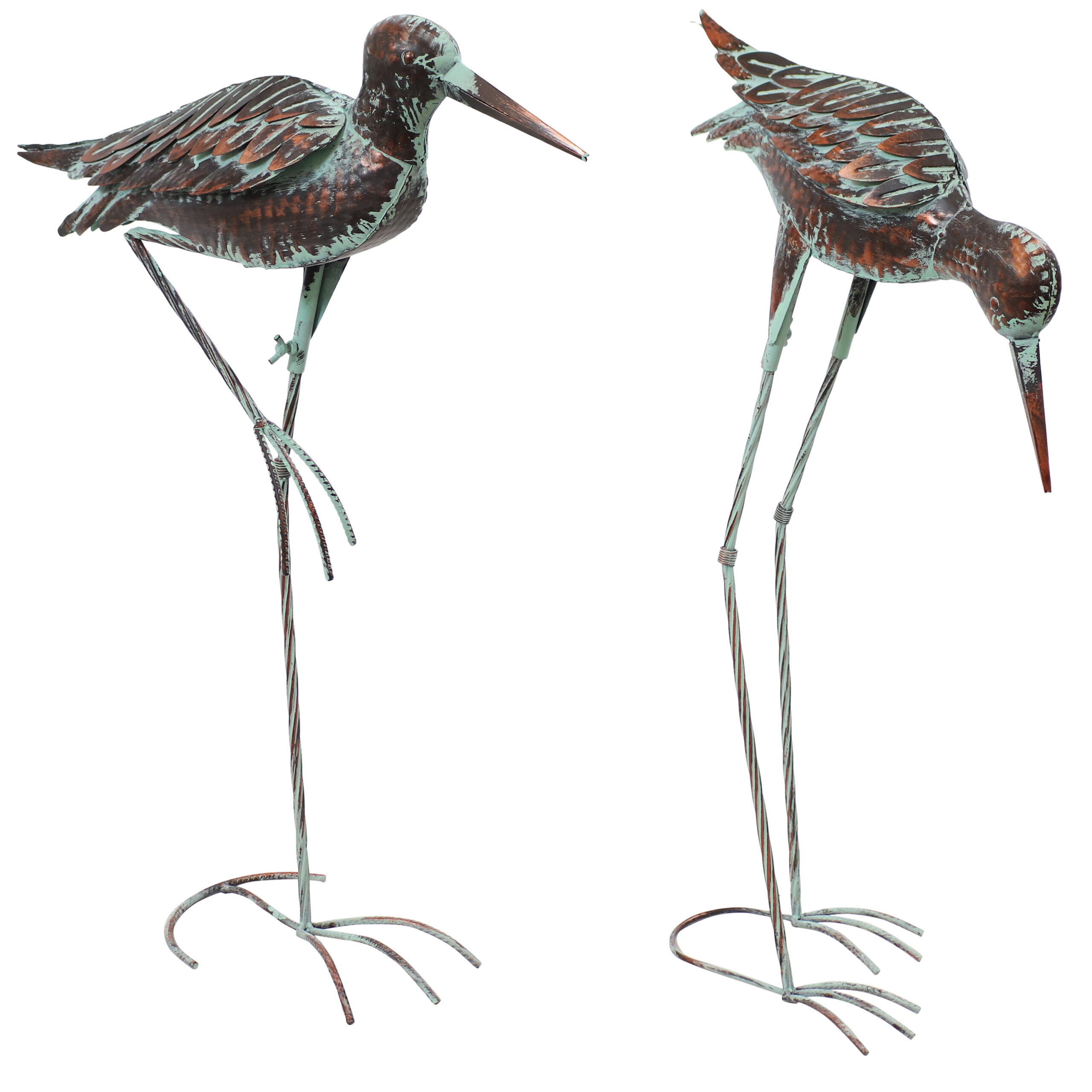 Add a rustic yet elegant style to your garden, yard, or patio with these two lively crane statues. Both cranes are made with durable and rust-resistant iron and are finished with a brown coating and blue paint accented in each layered feather. These outdoor statues are designed to stand on their own with rounded feet. The crane bending towards the ground perfectly complements the crane standing tall on one leg and accentuates your own outdoor setting, adding a lively, natural look to your space.