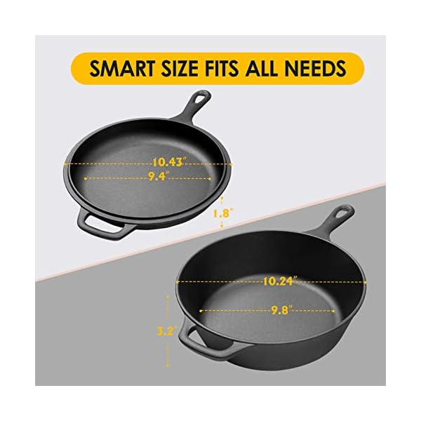 ✅【VERSERTILE USAGE】Whether you’re at home or out of doors activities,these cast iron skillet with lid can be utilized on quite a lot of all stoves including gas, electric, induction and ceramic-glass top stoves, ovens and BBQ. This iron pot allows the excellent quality of cooked food with great taste and flavors with frying, baking, grilling, broiling, braising and sautéing meats, vegetables and more!