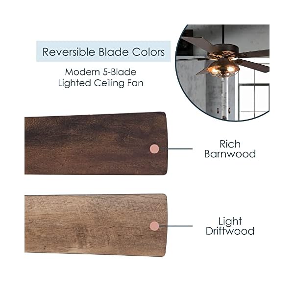 VERSATILE LIGHTING: Our ceiling fan fixture includes 2 dimmable LED E26 8W/40W incandescent bulbs, 5 reversible blades in rich barnwood / light driftwood, and 2 pull chains. It measures 52″ L x 52″ W x 13.25″ H and 18.25″ H with included 6″ downrod.