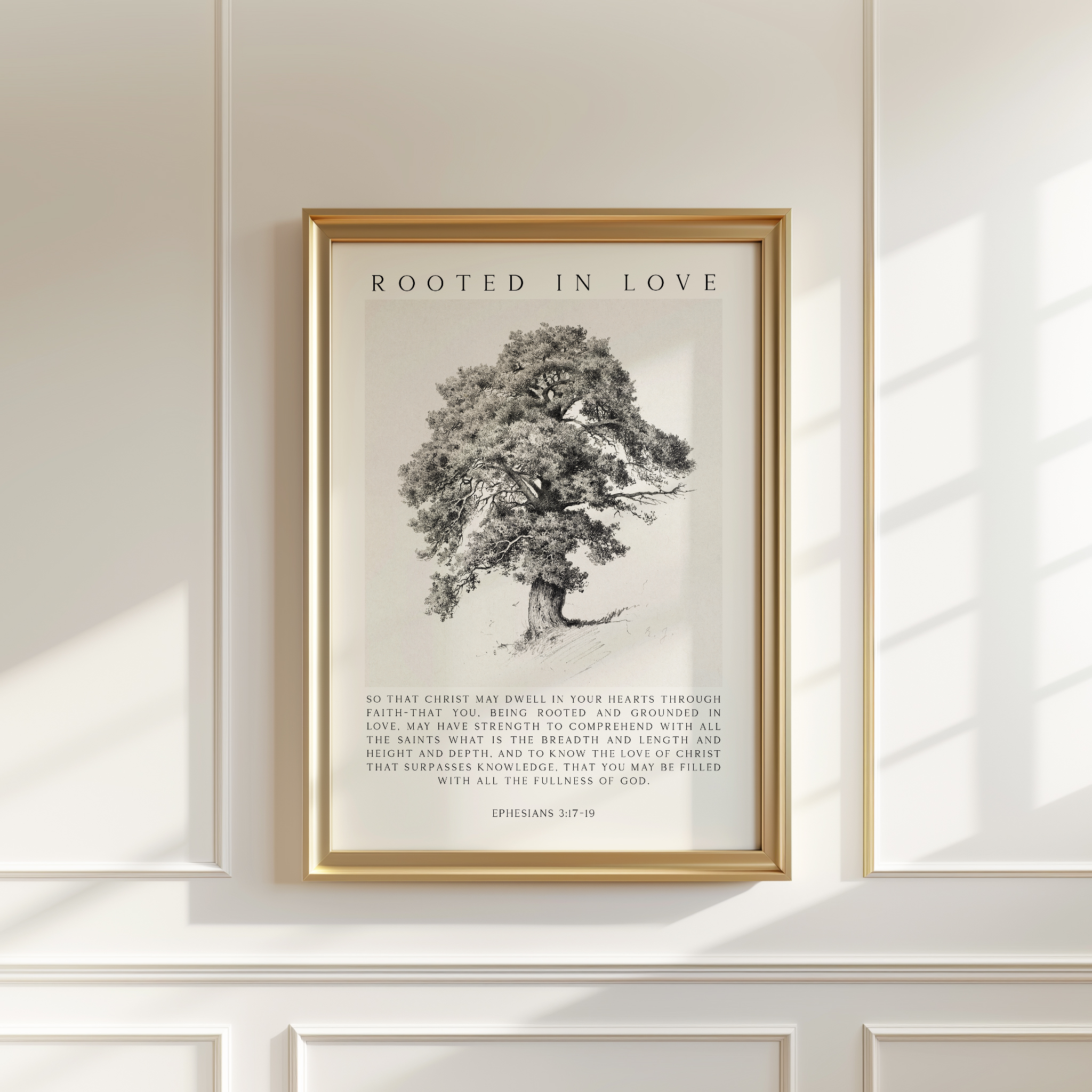 This “Rooted in Love” Typography Art Print pairs the beloved Ephesians 3:17-19 verse with the Finnish Mänty tree illustration. The towering tree symbolizes faith, endurance, and growth in love, beautifully reflecting the scripture’s message of being deeply grounded in Christ.