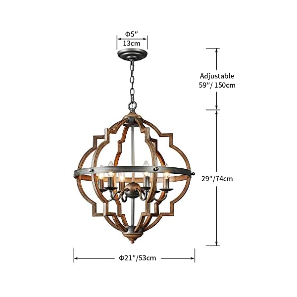 Fixture Dimension for this farmhouse chandelier: Height 29 inches x Diameter 21 inches, Chain/Cord Length: Max 60 inch, length adjustable, sloped ceiling adaptable.
