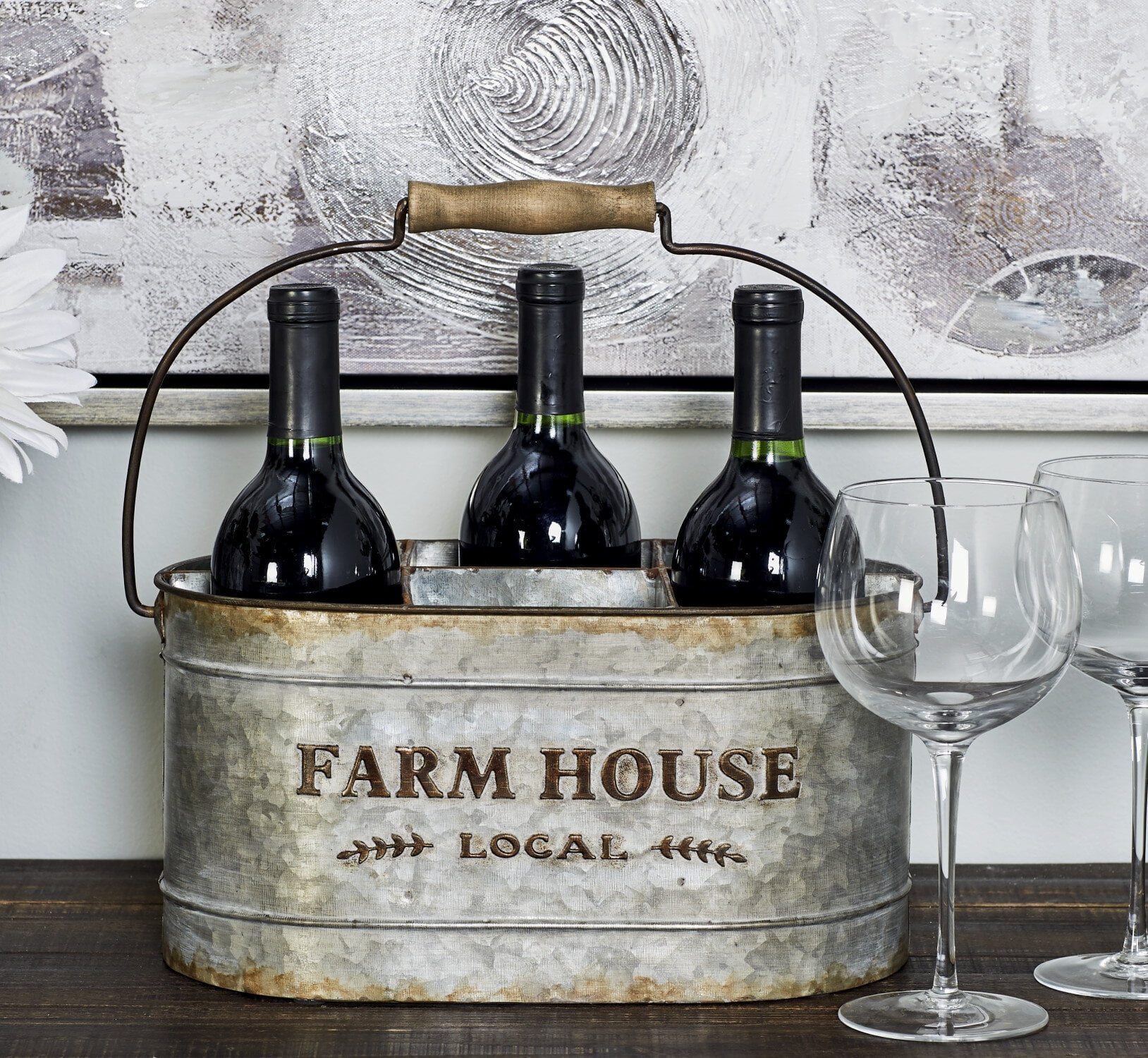 Enjoy the beauty and security brought by this farmhouse style grey metal wine bucket in your home. The metal material is the perfect vessel to hold and display your aged wine collection in vintage fashion whether in your kitchen, dining room, or living room. The distressed rust and grey finish give this wine holder an antique appeal. Display this on any surface and see how it draws attention towards your wine collection. This item comes shipped in one carton. Suitable for indoor use only. This item can sturdily hold 6 wine bottles. Features large lettering reads “Farm House Local”. Farmhouse-themed style.