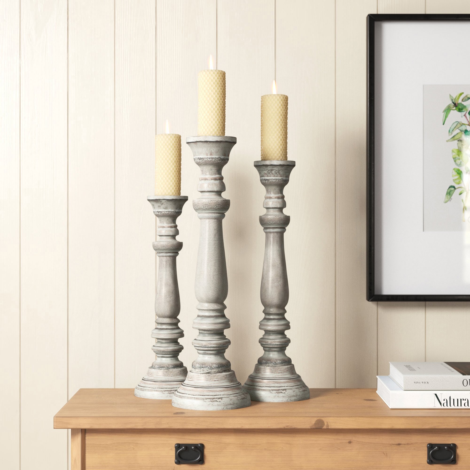 Nothing says ambiance quite like a flickering flame! Put your favorite scented candles or flameless designs on display with this essential three-piece candlestick set. A versatile addition to your abode, it can be used as your dining room centerpiece, an accent on the entryway console, or even put to use in the bathroom for relaxing soaks in the tub. The same design in a trio of sizes, each is crafted from wood and takes on a turned silhouette.