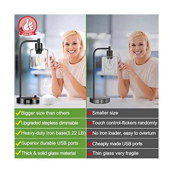 Set of 2 Industrial Table Lamps with 2 USB Port, Fully Stepless Dimmable Lamps for bedrooms, Bedside Nightstand Desk Lamps with Seeded Glass Shade for Reading Living Room Office 2 LED Bulb Included