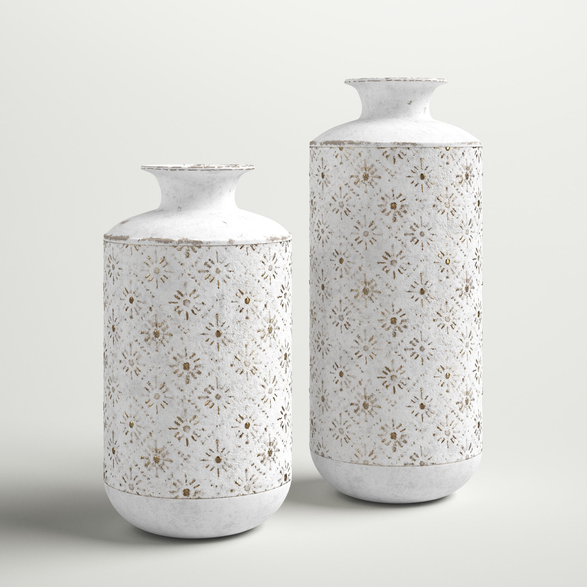 Add a clean, classic style to your space with this 2-piece set of matching table vases. Handmade from metal, this set features two vases with traditional cylinder silhouettes, narrow necks, and flared rims. An embossed geometric pattern shows off sunbursts, while an all-over white finish has just the right amount of distressing for an antiqued vibe. The tallest vase measures 15” high, while the smaller of the two is just over 12”. We love that these vases work as visual accents or as holders for your favorite flowers.