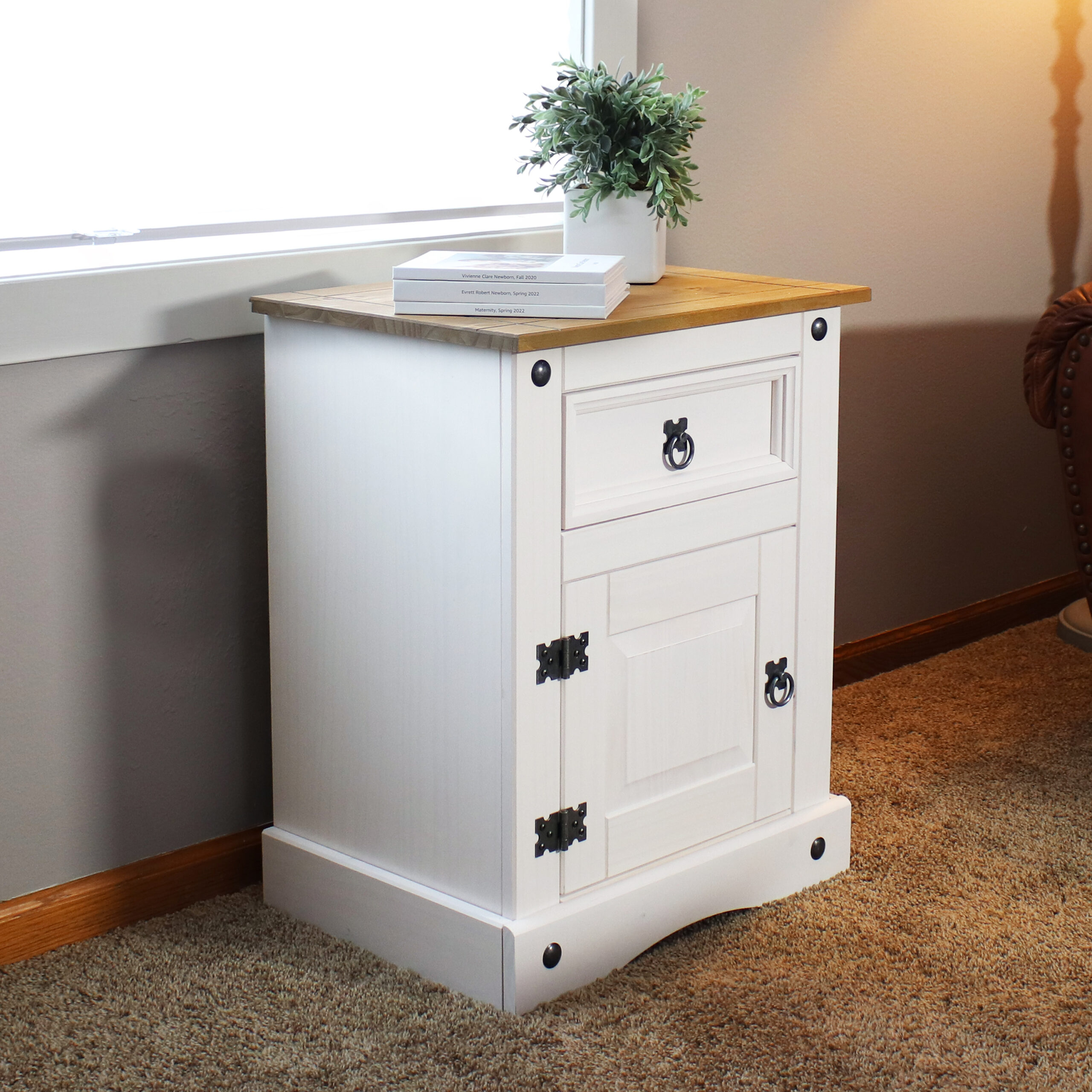 This versatile white side table is the perfect piece to complete your living room or bedroom furniture set. Made of solid pine, this farmhouse end table features a classic, two-tone design with a wooden tabletop and white body. Place it beside your favorite chair, next to a sofa or loveseat, or use it as a nightstand next to your bed. It features a convenient drawer and inner cabinet to tuck clutter like remote controls, video game controllers, and magazines out of sight when not in use.